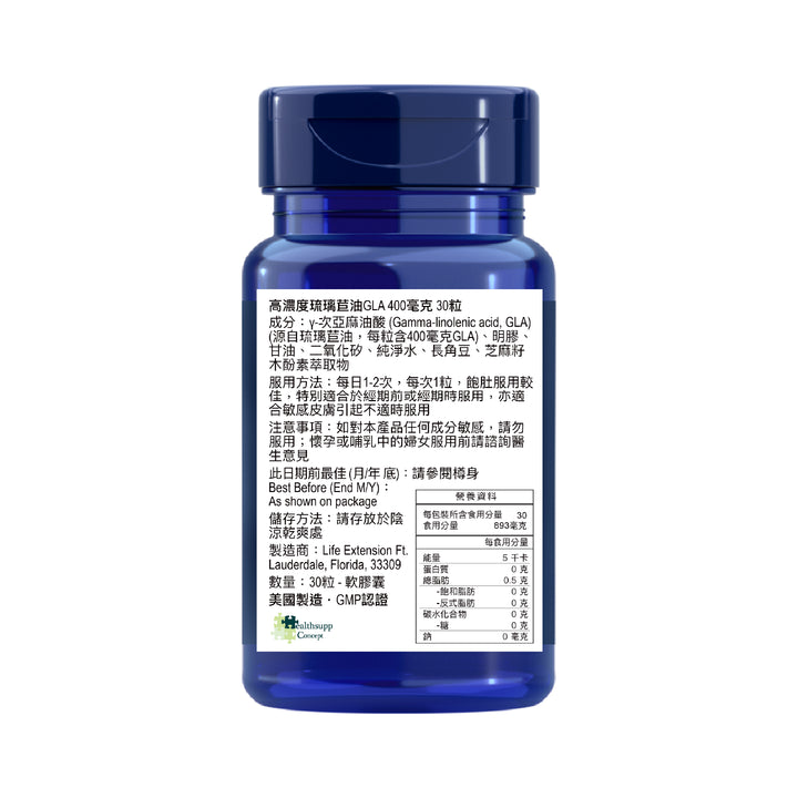- 每粒含高達400毫克GLA,遠高於市面上一般月見草油及琉璃苣油產品,每日1粒已能滿足所需