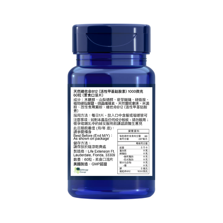 天然維他命B12 (活性甲基鈷胺素) 1000微克 60粒 (素食口溶片)